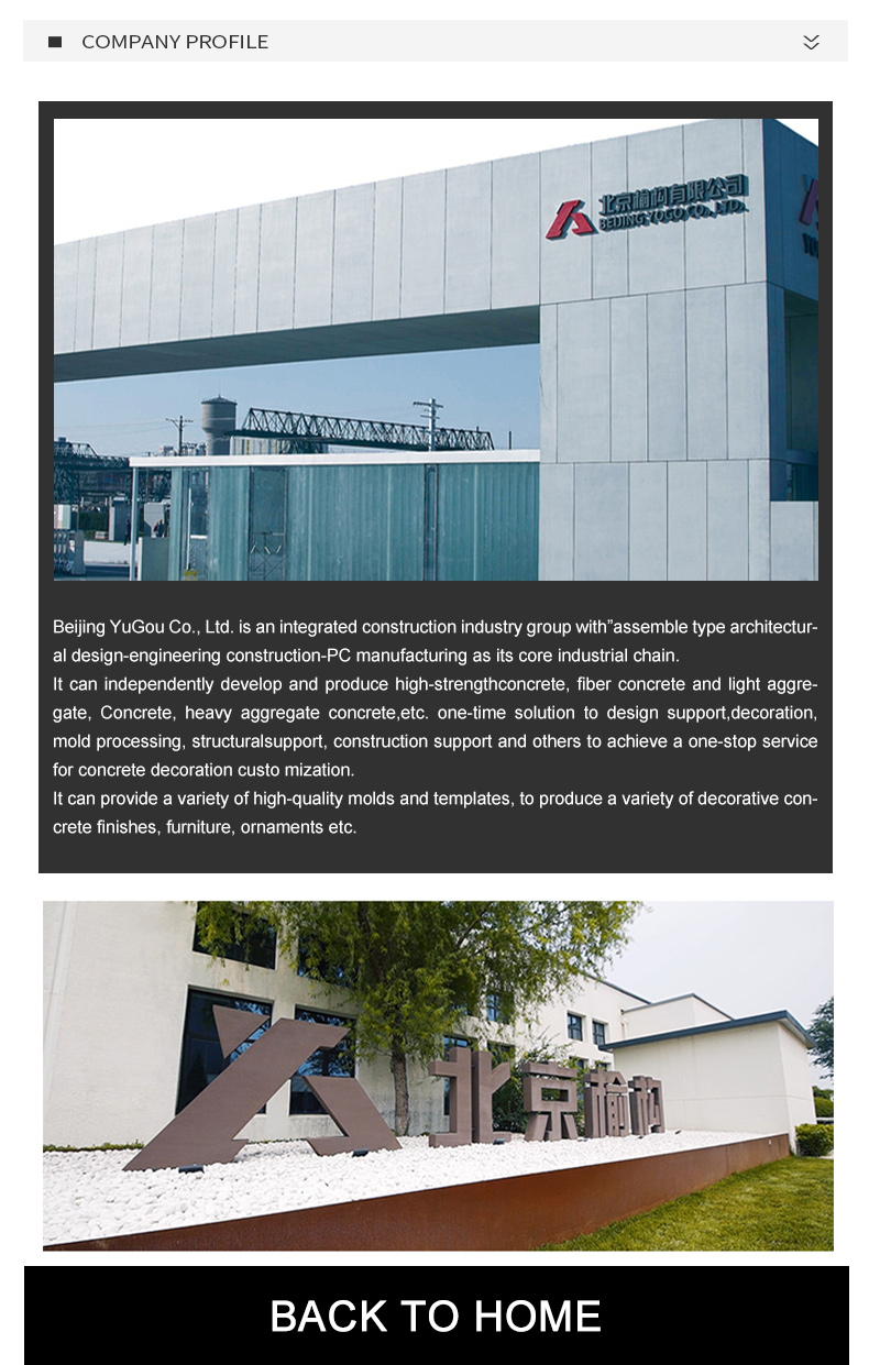 Beijing Yugou (Group) Co., Ltd. is an integrated construction industry group with “fabricated building design-engineering construction-PC manufacturing” as its core industrial chain. Founded in 1980, the company has more than 1,000 employees, covers an area of 350,000 square meters, and has a construction area of 30.000 square meters. The registered capital of the enterprise is 150 million yuan. It has the country’s leading professional material research laboratory and product research and development center, and a professional and technical research and development team of more than 100 people. It can independently develop and produce high-strength concrete, fiber concrete, light aggregate concrete, heavy aggregate concrete, etc., concrete production The process realizes erp network management, which can solve the problems of design matching, decoration matching, mold processing, structural matching, construction matching and other problems at one time, and realize one-stop service for concrete product customization. The company has 150 sets of concrete production equipment and various large-scale lifting and transportation equipment, which can achieve an annual production capacity of more than 1 million cubic meters of concrete. Concrete products are widely used in industrial and civil construction engineering, municipal highway engineering, railway engineering, water conservancy engineering, home decoration and other special engineering fields. At the same time, we can provide a variety of high-quality molds and templates to make various decorative concrete finishes, furniture, ornaments, etc., in line with GB50210 “Quality Acceptance Specification for Building Decoration Engineering”, with 3 invention patents, 6 practical patents, appearance More than 100 design patents, more than 20 proprietary technologies, and 5 award-winning scientific and technological achievements.